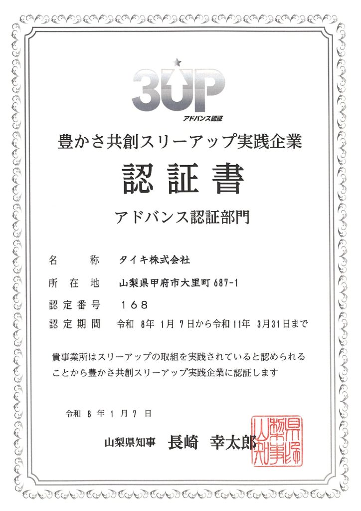 このたび当社の甲府事業所は、山梨県の『スリーアップ実践企業認証制度』においてアドバンス認証を取得いたしました。 経営方針等の共有・意見等の尊重・スキルアップへの取り組みを推進し、持続的な成長と働きやすい職場づくりを進めてまいります。