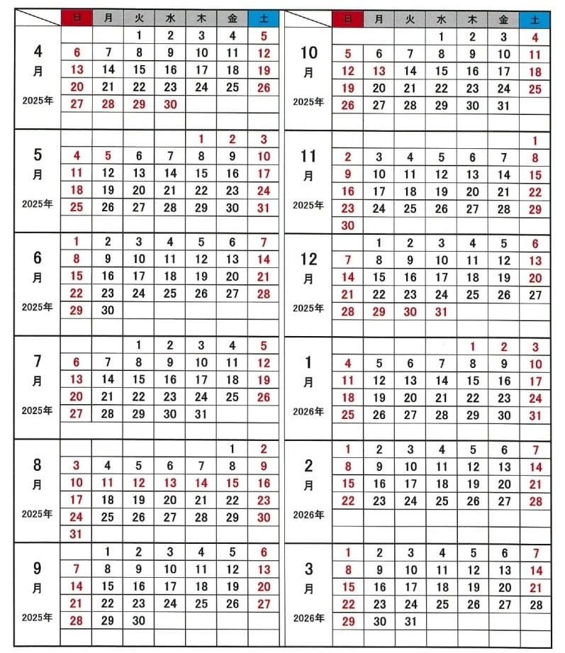 ※作業の都合上、休日を振り替える場合があります。ご理解ご協力のほどお願いいたします。