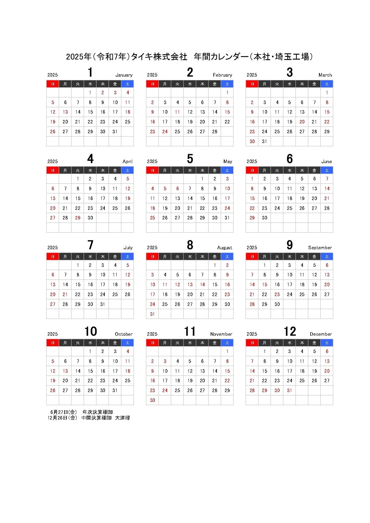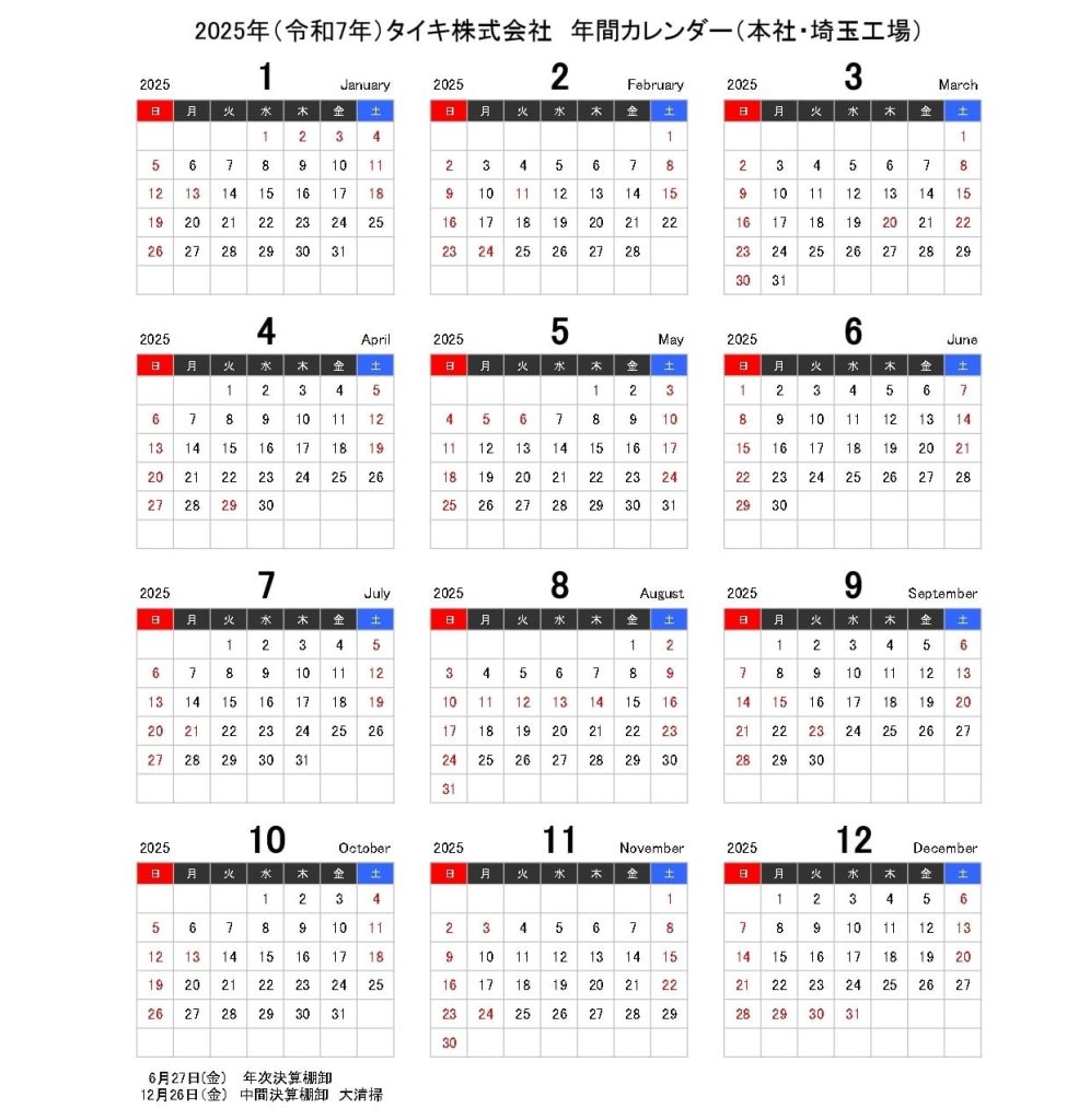 タイキ株式会社本社・埼玉工場2025年カレンダー(PDF)