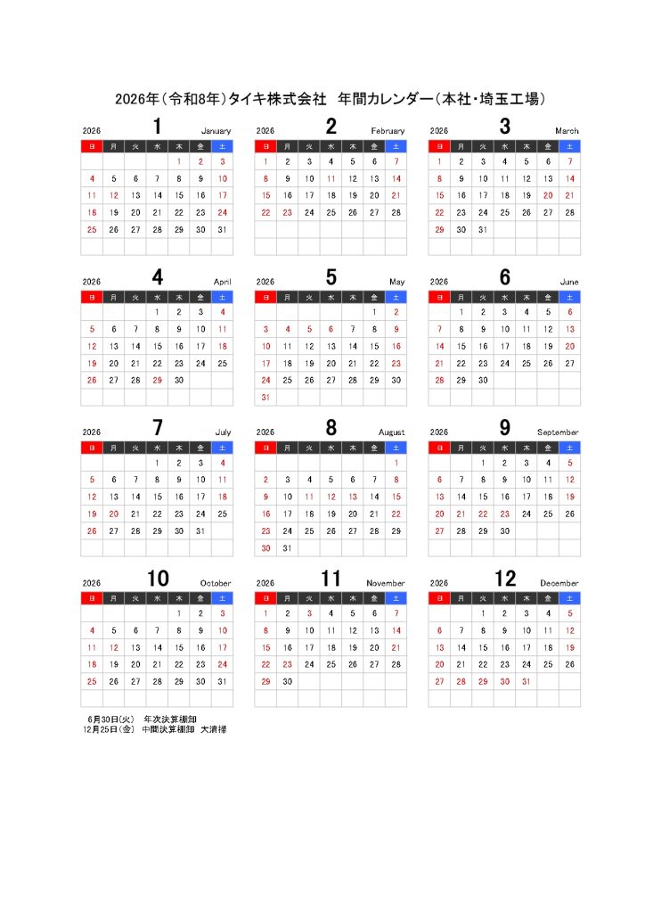 タイキ㈱本社・埼玉工場2026年カレンダー